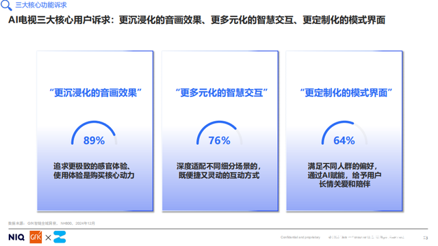 通过指南数据显示,AI电视的三大核心用户诉求是更沉浸化的音画效果、更多元化的智慧交互和更定制化的模式界面。
