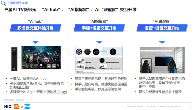 其次是智慧交互:AI电视应具备语音交互、手势控制和设备互联功能。例如,三星的GalaxyWatch通过手势操作就可以实现对电视的控制,即使你的双手不方便使用遥控器,也不耽误操作电视。此外,针对语音控制上,通过AI能力也实现了大幅提升,三星基于大语言数据模型的IOT能力提升,譬如从前我们要说打开空调,但现在在AI技术的加持下,我们只要说“我热了”,这种更接近于我们日常交流的指令,就可以完成操作。